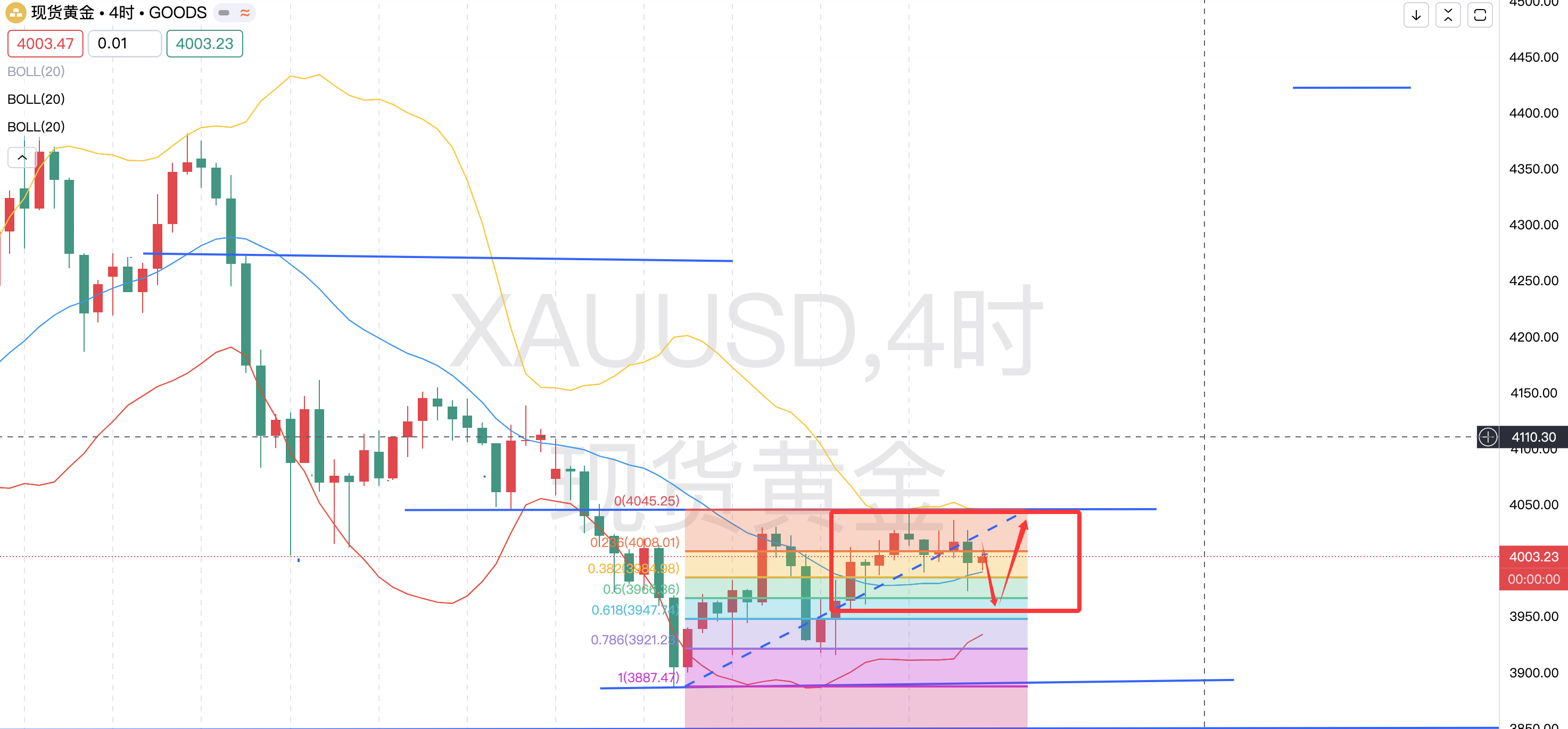 因美联储政府停摆,联储内部分歧较大,没有太多经济数据参考12月到底是降息还是维持利率不变还是个疑问,价格呈现市场也是围绕震荡继续进行,基本面喜忧参半情况下,所以目前没必提前去猜测单边,总体围绕目前区间短线高空低多即可,区间位于4047-3885整理,4小时布林逐步收窄围绕区间作高抛低吸,等待价格方向选择确认后再作跟随即可,重点压力4047,重点支撑3885。随着短期布林越收越窄区间内下周操作依托3955-60继续多下破47止损,目标3970破位看85-90,上方4030-35空,上破4047止损。总体而言不要急于追涨杀跌,重点关注下方3947,上方4047-50突破情况再顺势,暂定围绕震荡多空短线进行即可!