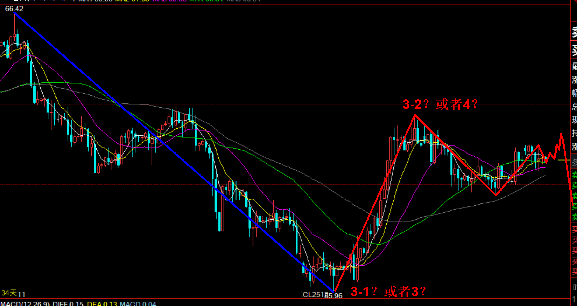 目前的行情一直在我们所数的4浪或者3-2浪之间震荡,行情最终属于4浪还是3-2浪都需要后面的行情来验证,但是在走势方向上它们是一致的,所以我们暂且先不管到底目前这波上涨是4浪还是3-2浪,至于怎么验证呢?如果这几天的行情继续下跌了,且跌个七八美金就又上涨个四五美金,最后再下跌六七美金,那么目前这个上涨就是3-2浪,如果后面的行情继续下跌且跌幅是十多美金甚至更大的跌幅,然后跌到位止跌开始一路的上涨,那么目前这波上涨就是4浪了,只是需要看这波上涨回撤到位没有?目前数浪的3-1或者3浪从66.42美元跌到55.96美元,跌幅是10.46美元,而目前这波上涨的3-2浪或者4浪从55.96美元涨到62.59美元,涨幅是6.63美元,已经回撤了63%左右了,如果说还没有回撤到位的话,再往上也就是最多在80%左右了或者70%左右了,所以我们今日冒险用小的止损去做空试试看。