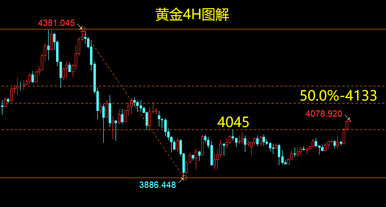 亚盘价格实际放能上破4045及3886-4381连线38.2%节点4075,4H图结构强势,反弹高点调整至4100及50.0%节点4133;短线支撑4070-4066,强支撑4060-4050;