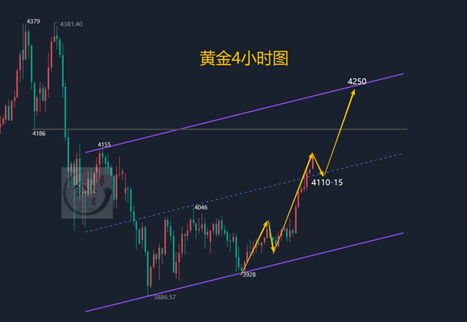 本周市场利好密集,周一美国政府重启会议,可能会结束停摆,周四有CPI数据公布,周五有ppi数据公布,如果美国政府正常运行,周四,周五的数据就有较大的影响。现在的行情既有市场基础,也有盘中表现,就差一点数据影响,不然多头会走的更加凶猛。周一分析过,本周黄金破位4050后,就看单边走势,上方可以看到4200,4300,现在走势明显,周一直接破位4050,单日上涨有100多美金空间,在确定单边行情出来后,那么,今天延续看单边上涨走势。从技术面来看,日线底部震荡结束后,上涨目前破位布林中轨压制,那么接下来上方只有布林上轨目标点4300,当后市不破布林上轨压制就要靠多头是否有竭力,但在此之前,要坚持贯彻看多头的上涨空间。4小时周期布林上轨已经开口,多头力度才刚刚开始,所以没有什么好说,这波一定要坚持看涨,注意两个原则:顺势做多不猜高,坚决不做空。那么,今天顺势做多的点位在小周期表现的4110附近,全盘以此为支撑看涨即可,上方看至4186,大力度直接看到4250。综合来看,今日黄金短线操作思路上金晟富建议回调做多为主,反弹做空为辅,上方短期重点关注4186-4250一线阻力,下方短期重点关注4110-4115一线支撑,各位朋友一定要跟上节奏。要控制好仓位及止损问题、严格设止损,切勿抗单操作。具体点位以盘中实时为主,欢迎前来体验,交流实时行情,进群关注实时单。