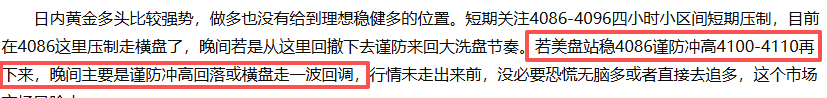 昨日日内四胜三负小胜收官!美盘前我们有公开提出晚间重点关注4100-4110压制,有效压制会走出一波回调。美盘后走势比较符合预期,遇阻回落最低给到4074,小赚收官已经比较满足了。