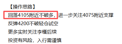 上方阻力早盘继续关注4150-60这里得失!后半周也要注意大洗盘走势,日内早盘若站稳4163关注测试4180-90,意外持续走强走高破位继续关注4200和4230。下方回撤继续先看4115反应,破位继续关注4100区域。若下方洗盘走低4090,就是奔向4075去的。