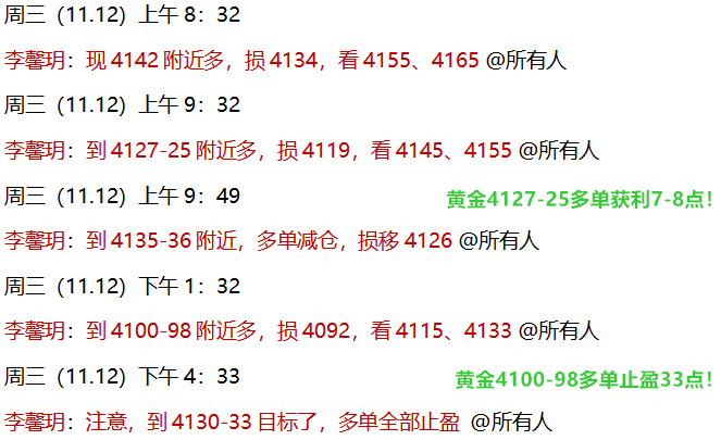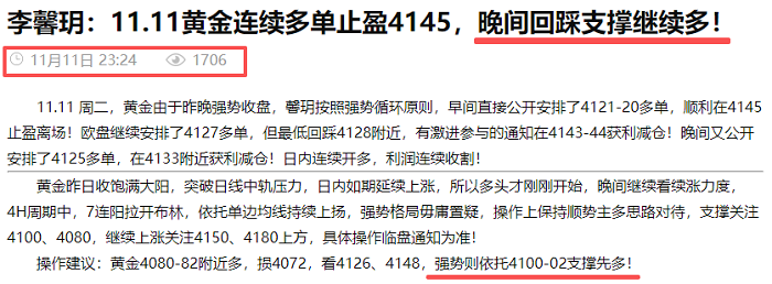 11.11 周二,黄金由于昨晚强势收盘,馨玥按照强势循环原则,早间直接公开安排了4121-20多单,顺利在4145止盈离场!欧盘继续安排了4127多单,但最低回踩4128附近,有激进参与的通知在4143-44获利减仓!晚间又公开安排了4125多单,在4133附近获利减仓!日内连续开多,利润连续收割!