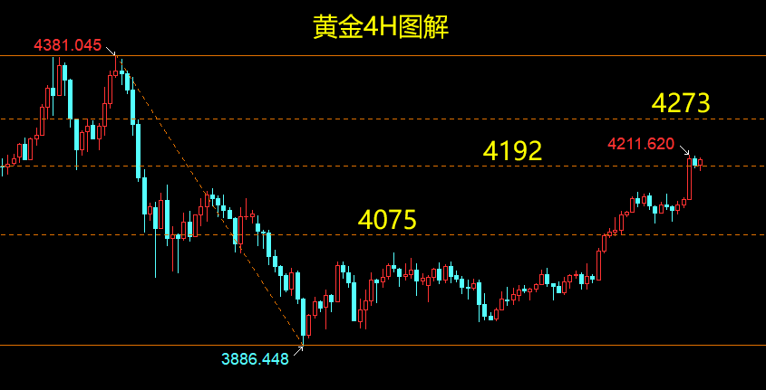 早间开市4195,白盘时段短线支撑4186-4180,强支撑4170-4160,日图MA5-4125偏离较远;短线阻力4202-4211,强阻4H图上轨4230,破位上看4273;