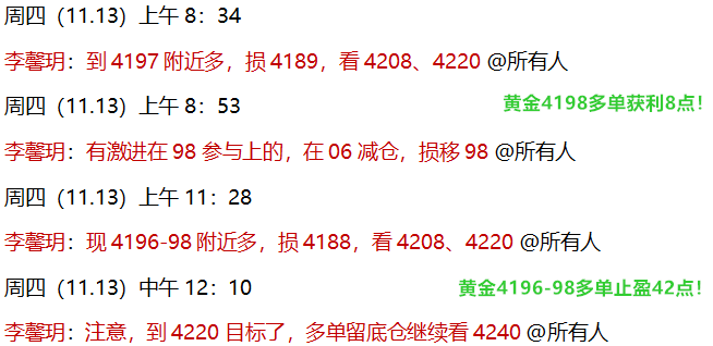 11.13 周四,馨玥策略思路一直强调黄金看涨,实盘中,早间安排的4197多单,差之毫厘未能进场,激进在4198进场的学员,在4206获利减仓!午间又安排了4196-98多单,顺利在4238-40全部止盈离场,整体收44点!一直关注的朋友都知道,馨玥看涨做多是认真的!本周全是多单,利润自然不会少!
