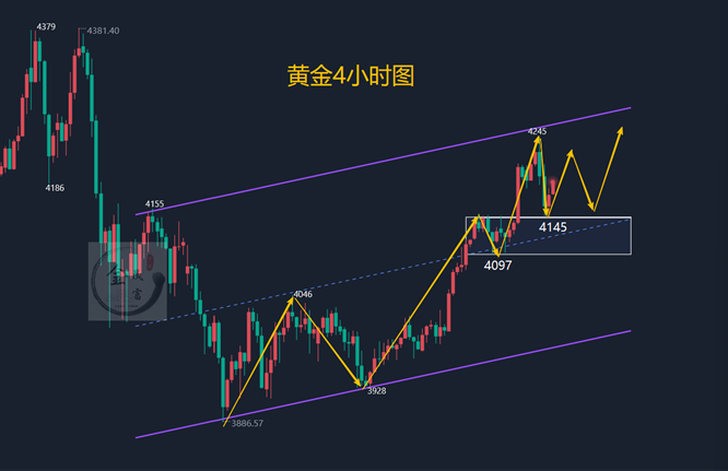 从技术面来看,其实日线的上涨空间并没有走完,这波至少看到4300才可能结束,而实际在4245开始下跌,那么尊重市场,在日线首次收阴后就不要过分看上涨空间,4小时周期就不一样,经过回落调整,但没有破位布林中轨支撑点,所以还是绝对的强势,今天在中轨之上看涨的话,继续看上方4250,4300,如果4250不破就以短线看待,4250破位再看4300本周目标点。小周期的话,今天关注关键支撑做多即可,早盘回落至4170后上涨,日内激进的话就以此支撑做多,如果意外继续下行,就以4150支撑做多,耐心等待周五的上涨空间,当然,刚刚讲过,周五看震荡慢涨走势,上涨后不管是4250还是4300均可根据实际是否破位考虑做本周的回落空间。综合来看,今日黄金短线操作思路上金晟富建议回调做多为主,反弹做空为辅,上方短期重点关注4250-4275一线阻力,下方短期重点关注4150-4170一线支撑,各位朋友一定要跟上节奏。要控制好仓位及止损问题、严格设止损,切勿抗单操作。具体点位以盘中实时为主,欢迎前来体验,交流实时行情,进群关注实时单。