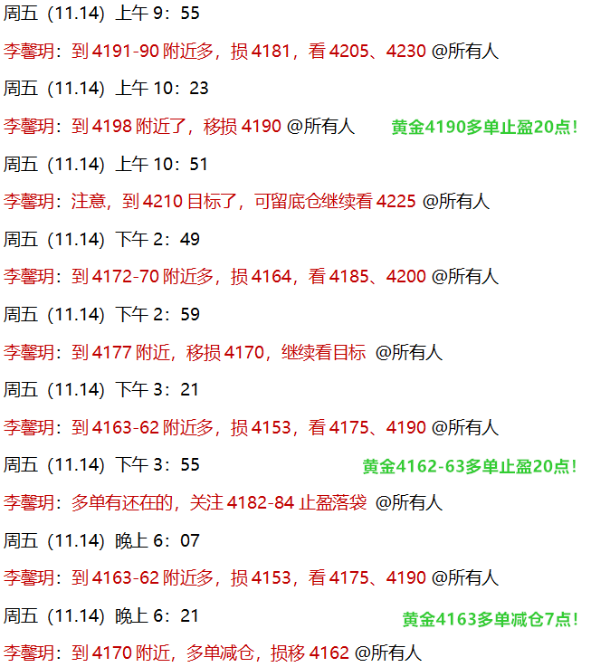 11.14 周五,公开策略中提示黄金4160做多,如期上涨至4186大赚!另外提示了4145做多,也反弹到4158获利!跟上策略的朋友均有不错收获!实盘中,早间公开安排了4190破位多单,在4210止盈出局!欧盘前按策略又安排了4162多单,也反弹至4182-84止盈出局!晚间继续安排了4163多单,在4170收获减仓利润!日内整体收获44点,晚间通知观望,又规避了大跌,本周圆满收官!