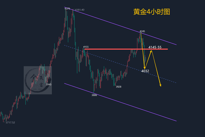 从日线来看,日线昨天早盘强势拉升至4211附近受阻回落,受停摆结束抛售影响,晚间大跌至4032附近,差不多180美金,日线最终收阴。按照目前走势,周一应该继续看空。日线阻力4155附近,下周如果有机会反弹这里是理想的做空位置。不过凌晨反弹高点在4111附近,行情要想下跌大概率会在其下方运行。1小时线阻力在4110附近,周一这个位置不破可以做空。下方目标先看4065-4055附近,下破看4032-4000附近。 4000整数关口附近不破做多,跌破反弹找机会再空。综合来看,今日黄金短线操作思路上金晟富建议反弹做空为主,回调做多为辅,上方短期重点关注4097-4100一线阻力,下方短期重点关注4030-4000一线支撑,各位朋友一定要跟上节奏。要控制好仓位及止损问题、严格设止损,切勿抗单操作。具体点位以盘中实时为主,欢迎前来体验,交流实时行情,进群关注实时单。