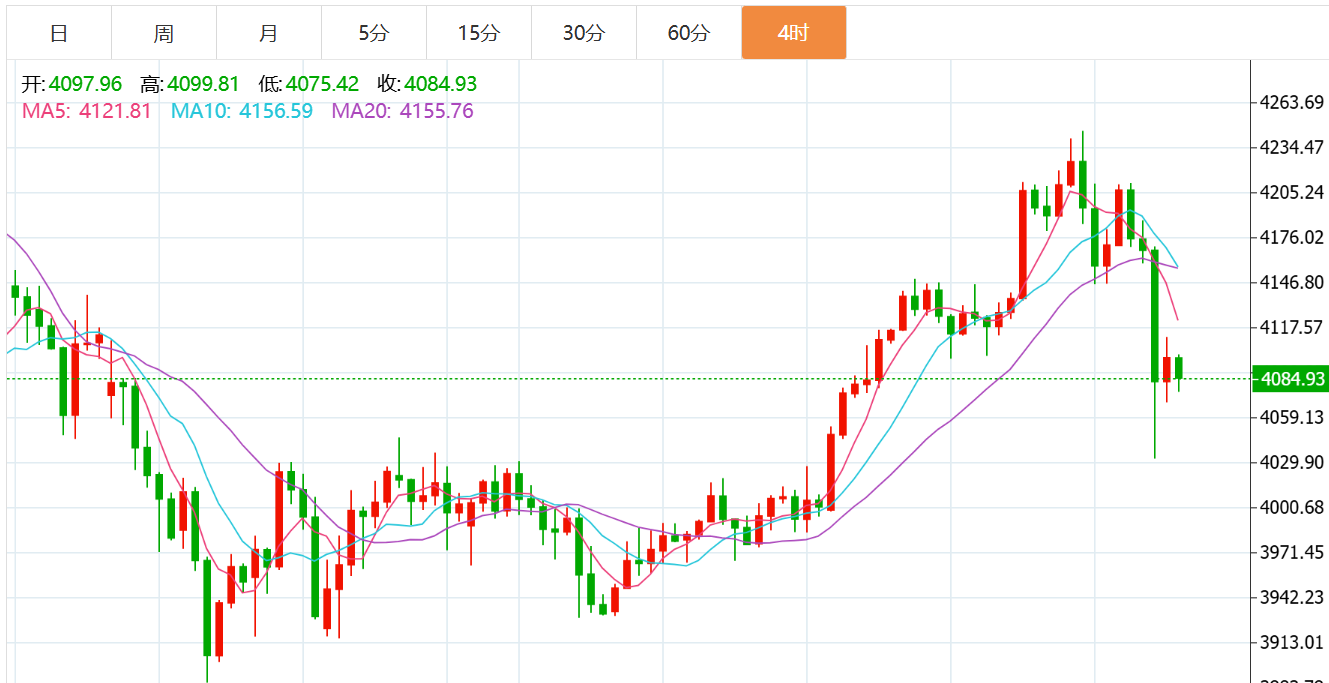 黄金4小时昨日一波上涨,短线延伸性不足,昨日探高后回落至中轨附近震荡,4小时结构多空转换当中。目前的结构还是处于小级别的上升当中,今日留意中轨的得与失,失守中轨也就是昨日低点才能转弱。否则短线还会继续保持这种拉锯震荡。剖开短线的迂回反复,主思路还是围绕波段性高空看调整,此前布局的空单继续持有,空仓的今日围绕4100-4130之间分批入场空单,每10-15美元分批入场,目标看回4030-4000一线。综合来看,黄金下周短线操作思路上贺博生建议以反弹高空为主,回踩低多为辅,上方短期重点关注4110-4140一线阻力,下方短期重点关注4050-4030一线支撑。