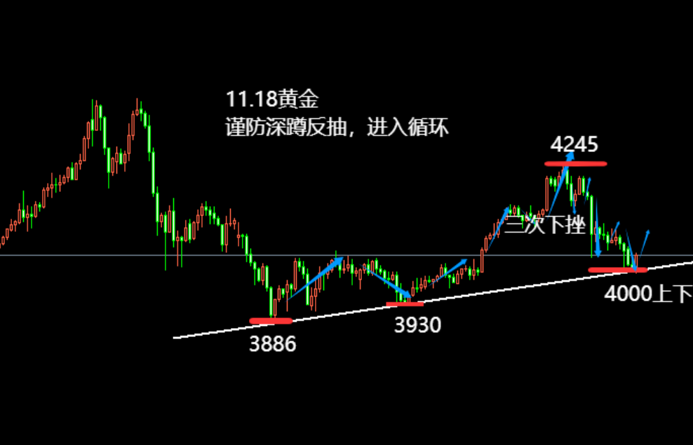 结合当前盘面走势来看:先看一下本轮回撤力度;上周四确认4245压力后出现了承压下探4145(完成了100刀的跌幅)随后反弹再次确认4210上下压力震荡后周五欧盘实现了有延续性下挫跌破4150下并在晚间加速一度延伸至4030位置(第二次完成了180刀的下跌)随后就是本周昨天第三次确认4110压力后呈现扫荡洗盘式下跌(白盘反复震荡洗盘,晚间跌破4030去下探4005位置并最终探底回升收线在4040上,跌幅也是100刀上下)日线呈现三连阴下挫,而对比三次下跌来说前面两次最终确认压力下探的速度快,幅度大,延续性好;而第三次虽然随着时间走高点未破空间也是下抬的动作(但过程就更加的曲折了,其一每次下探之前都需要通过反复的去测试压力 以空间换空间借力,其二:整个下跌过程中截至目前都没有出现过干脆的坚定的延申房放量信号)那么这就足以证明两点,要么随着下挫空间的不断扩大(动能已经在逐步减弱)要么连续性下挫过后下方遇关键支撑或空间暂时守向对下跌步伐形成了干扰;综合这两点来说对于今天来说虽然节奏还是在偏空当中,但潜在变动的风险已经在增大,短线不宜在盲目追空看空,并在关键性支撑或分水岭区域需要考虑低多的跟随;