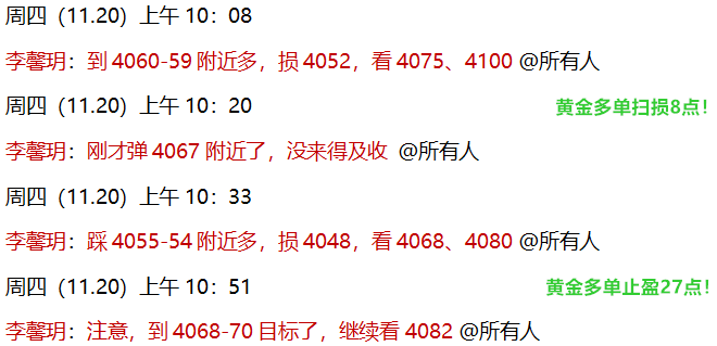 11.20 周四,今早策略提示黄金4055做多,行情在第一波下探后,实盘中4060多单无奈扫损离场,但二次下探反弹后,我们又将4054-56接了回来,并最终在4082-85止盈出局,扳回一城!市场上没有常胜将军,止损也是交易的一部分,合理做好盈亏比,就不会干扰操作节奏。