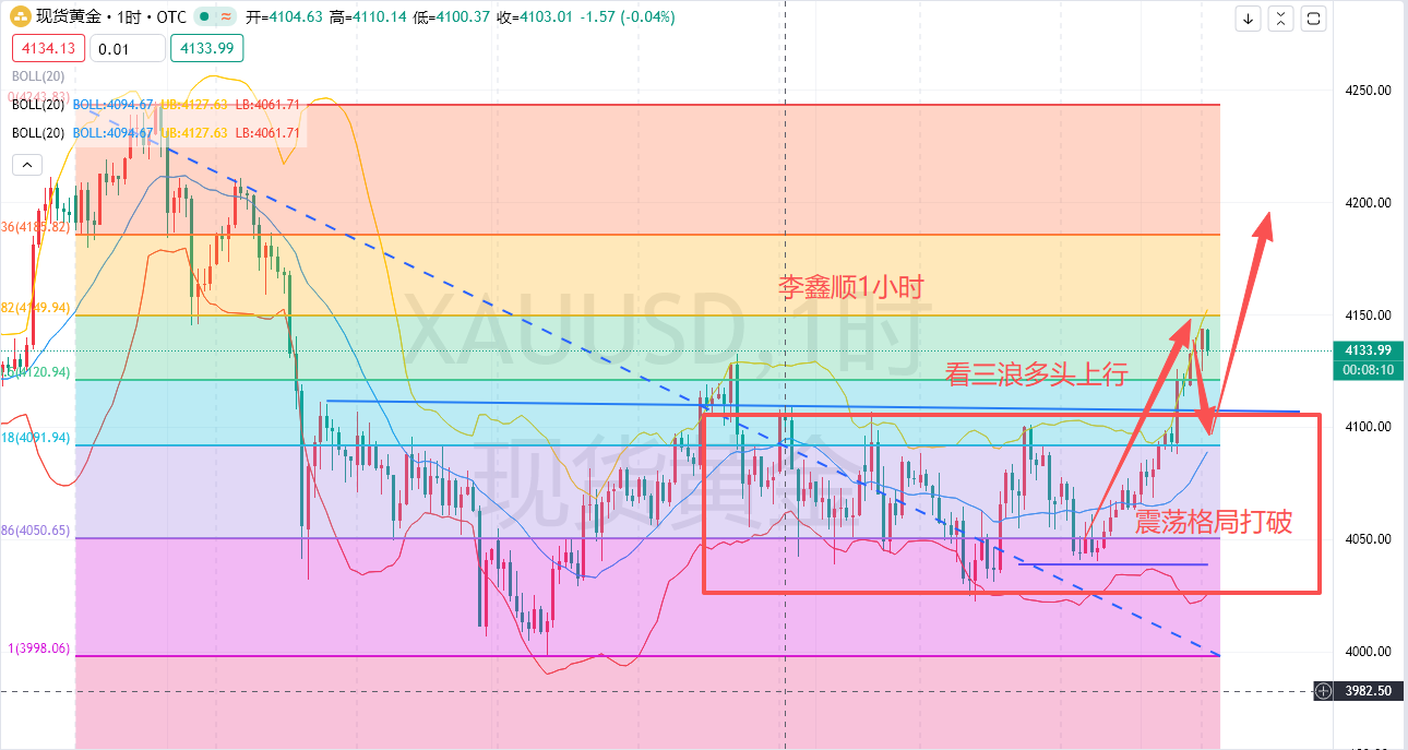 配合基本面黄金技术上,震荡格局被打破,日线收线大阳K,最低4040,最高4140.价格收线中轨之上, 多头再次占据优势,日内有进一步看涨突破动能,思路上主多辅空,降息预期再次重新燃起,多头趋势再次打开,强势不深调那么日内延续看涨机会则关注前期顶底转换4130-4100区域位置, 4100则是守住短期多头的关键分水岭,上方强阻压力则是4147-50,再则4185-4200区域。既然是跟随趋势主多辅空情况下,价格先涨的话可以依托4147-50区域短空一次。昨日旧金山联储主席戴利讲话前,4085-80的空也是短线了结获利,讲话前有很多不确定性,灵活应对!(对行情把握不好的朋友可以考虑加入鑫顺实盘,感受现价单,联系方式右上角主页)