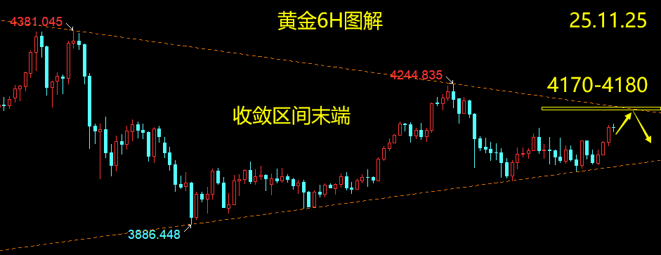 黄金,本轮价格自4381阶段高点抛售3886,回升4245后再次抛售3998,目前处于三角收敛区间末端,等待破位契机;周一价格从4040上行破高,文中强调4H图转强,周二延续看涨4101-4132,并等周中高点确认;隔夜实际上至4140,日图录得大阳,短线仍有冲高,上方留意4148及通道阻力4170-4180攻防情况,任意时刻触及均可尝试中线空;