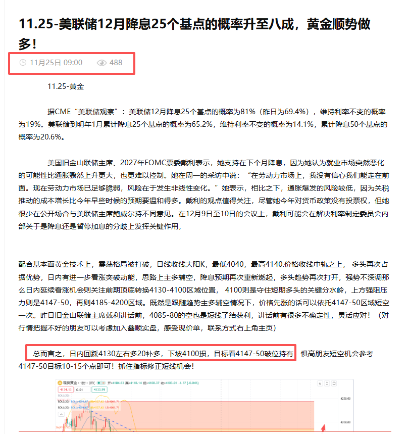 早盘给出的4130-20区域多如期上行,以多头目前的势头来看日内向上触及4200关口已成为大概率事件,美联储12月降息25个基点的概率为81%(昨日为69.4%),目前大背景基本面的推动的下黄金恐难以出现深调(意外深调观望再找机会)接下来就要以中长线的思路去对待,不断接涨去跟进这波新一轮的趋势上涨,日K技术指标MACD粘合即将初步形成金叉。大格局上确认看涨,短期如何再做多头切入才是关键所在,关注4144继续接涨,如果以短线思维恐高那朋友我只能告诉你你就只能选择观望,眼睁睁的去错过这波趋势。(对行情把握不好的朋友可以考虑加入鑫顺实盘,感受现价单,联系方式右上角主页)