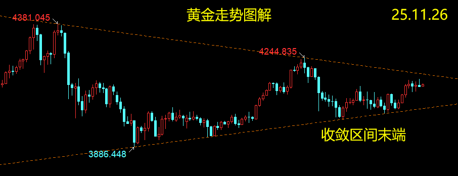 黄金,本轮价格自4381阶段高点抛售3886,回升4245后再次抛售3998,目前处于三角收敛区间末端,等待破位契机;周一从4040上攻4140,周二高位盘整,凌晨冲高4159回落,日图录盘整性阴柱,K线组合仍呈多头排列;周尾逢感恩节假期,预期仍以震荡上涨为主,关注通道阻力4170-4180攻防情况;