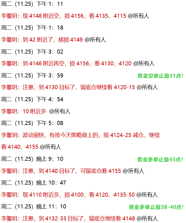 11.25 周二,策略中提示黄金高空低多卡点操作,白盘4150压力回落如期兑现,4110策略做多也是精准回踩低点,瞬间大涨!只要关注的朋友,都能有不错收获!实盘中,午后先公开安排了4148-4146空单,下跌至4120-15止盈离场!而后按公开策略,4110多单也顺利上涨4155止盈目标!午夜二次回踩,又安排了4110-11多单,隔夜在4150目标止盈出局!先空后多再多,拿下116点利润,创造当日最好成绩!策略思路精准兑现,拒绝马后炮!