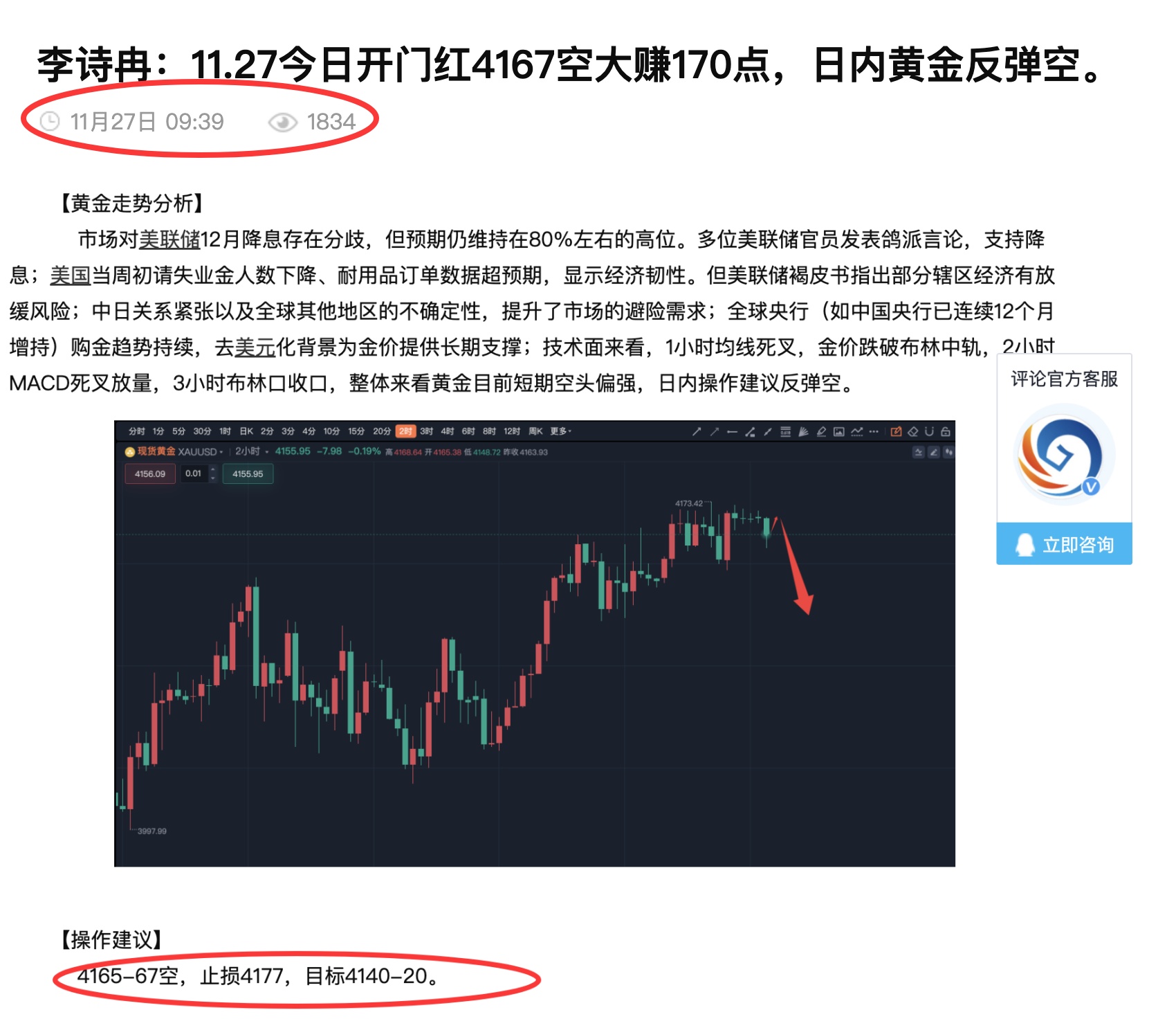 今日全网公开4167空,点位十分精准,实盘两波空获利270点;今日开门红4167空大赚170点;早间实盘在4167提示空,大跌至4150提示离场,这单大赚170点;午间黄金反弹上来,实盘在4154提示空,下跌至4144附近提示离场,这单获利100点;发文给策略次数有限,需要获取更及时的策略请前往主页获取诗冉老师联系方式即可,选择大于努力。
