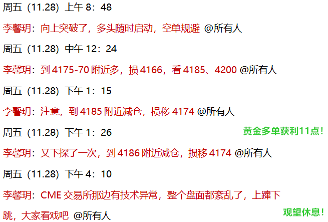 11.28 周五,策略中提示黄金4175做多,完美预判白盘回踩低点,实力全网见证,拒绝马后炮!实盘中,午间提前安排了4175多单,午后两次回踩进场,顺利到4185-88止盈目标,收获10-11点利润!后面收到消息(CME)芝商所出现技术问题,安排了提前休息,等行情恢复正常后再操作!本周11单全胜,圆满收官,公开操作真实可见!