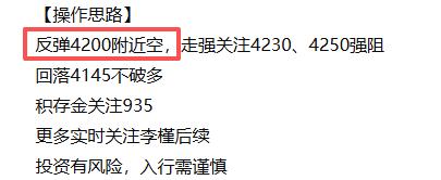 早盘公开反弹4200附近空直接兑现,短暂冲高4208后开始回落,目前持续收割中!早盘也有提到日内谨防冲高回落,今日还是需重点关注月线、周线能否完成“探高收低”,收官结果将直接决定下月调整空间的大小。冲高并非核心,短暂冲高不一定大涨走单边,持续性才是关键