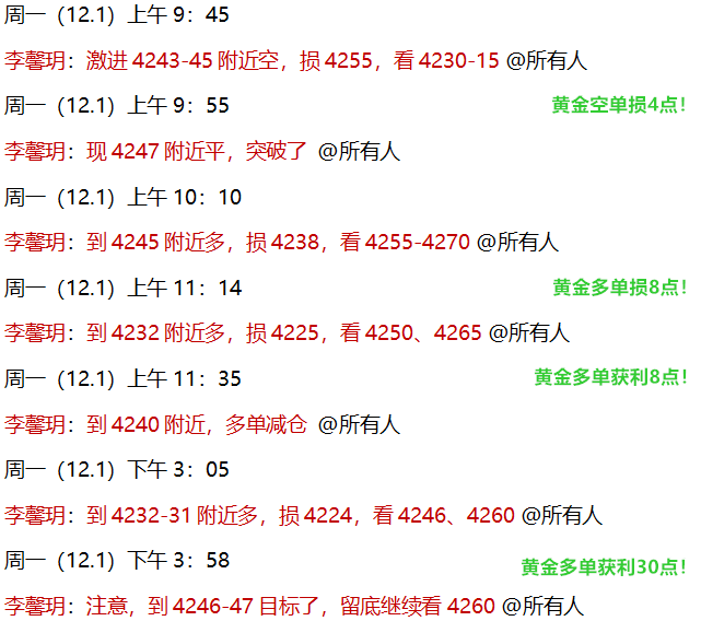 12.1 周一,黄金操作中虽有波折,但结果总是好的!实盘中,早间先安排了4243空单,过于强势在4247直接出局!回踩后在4245安排了多单,但破位次高点后未能延续,无奈扫损4238!而后,又在4232公开安排了两次多单,短线回调不惧,盘中坚定看涨,顺利上涨至4262止盈目标,底仓中线继续持有看4300!