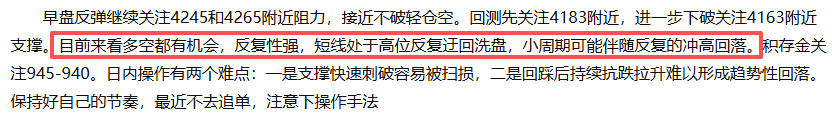 日内4206多单大赚!等待一天终赢回报!反弹最高触及4241附近,操作记录点击头像随便查看!我们早盘给出理想做空4245附近,其实也比较接近了。日内反复震荡洗盘,晚间又是冲高回落,早盘公开思路中就已经强调,小周期会伴随反复的冲高回落。尾盘继续关注4245压制,进一步关注4265强压,也是最近持续反复区。下方支撑短期关注4200小支撑,晚间跌破关注大支撑4183,4163 也是早上提到的位置。