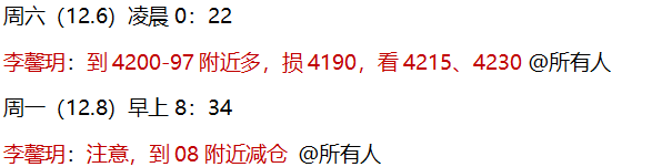 12.5 周五,策略中提示黄金白盘先震荡对待,午后冲高4230后正是策略高空位置,馨玥也没有犹豫,公开安排了黄金4228空单,顺利回落至4215目标,收获12-13点利润!晚间文章中提示谨防冲高回落,行情同样完美应验!不过我们选择观望收尾,守好本周的利润即可!