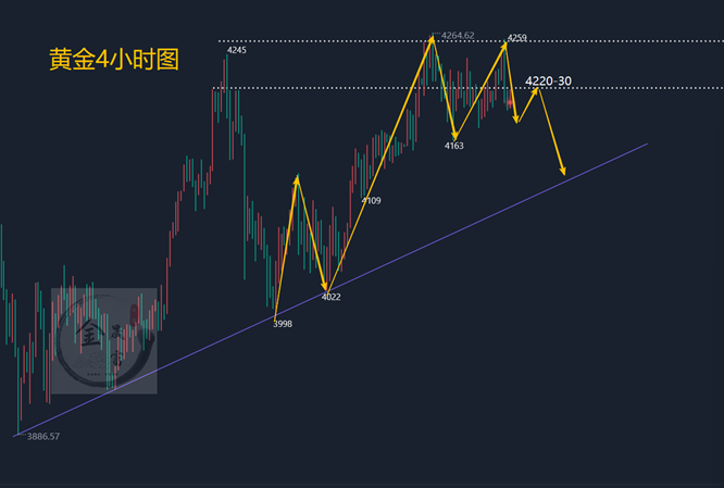 黄金技术面分析:黄金上周五冲高回落,黄金最终还是大区间震荡,本周四凌晨将公布美联储利率决议,那么黄金在美联储利率决议前大概率还是维持大区间震荡的走势。在经历了上周的暴跌之后,黄金依旧以震荡走势来看待,黄金今天开盘没有延续周五收盘下跌的情况,今天开盘4196一线然后震荡上行,今天我们继续保持周末给出的分析思路,反弹我们关注上方4220-30一线短期压制,目前来看,本次走势属于5浪上涨结束后的调整震荡,虽然趋势行情难在出现,但是波段走势幅度依然非常可观!黄金自周五4259位置开启回调,当前预计本次回调先止跌于4150区域。
