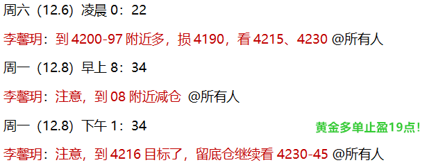 12.8 上周六午夜公开策略黄金4195-4200做多,完美兑现利润,日内如期上涨至4219附近!实盘中,同样安排了4197多单,顺利上涨至4219附近,已获利减仓开门红!