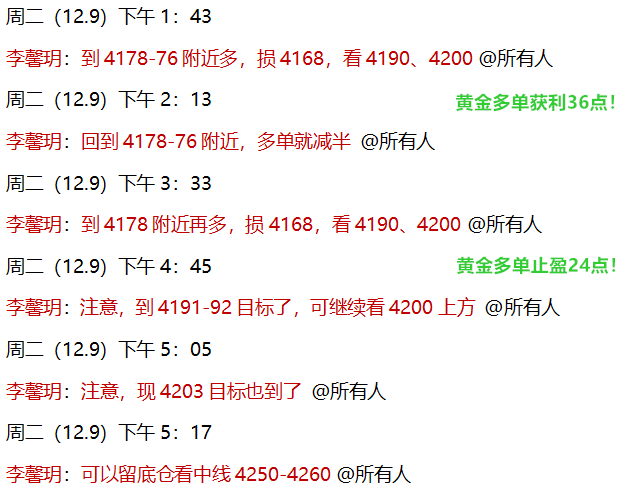 12.9 周二,黄金公开策略思路中4176多,4210空,高空低多全部兑现利润!实盘中,午后同样安排了4176多单,和4178-79多单,顺利到达4203-05目标止盈,整体收获50-60点!今天全网看空,馨玥独多,坚守多单迎来大赚!关注的朋友也收获了不菲利润!