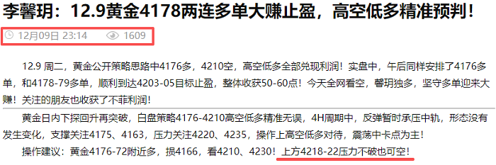 12.5 上周五,策略中提示黄金白盘先震荡对待,午后冲高4230后正是策略高空位置,馨玥也没有犹豫,公开安排了黄金4228空单,顺利回落至4215目标,收获12-13点利润!晚间文章中提示谨防冲高回落,行情同样完美应验!不过我们选择观望收尾,守好本周的利润即可!