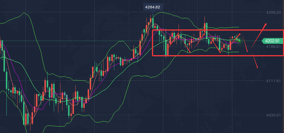 日线级别多头趋势未变,4小时图则维持震荡格局。目前布林带在4170-4230区间收口,日内可在此区间内高空低多。但需关注两点:一是周二走高后,下方支撑可能上移至4200附近,不一定触及4180;二是若强势突破4230上轨,布林带开口后将打开上行空间,目标可看至4260或更高。因此,日内操作上考虑在4190-4180区域布局多单,上方则看4230一线压制下可以轻仓布局空单。重点在午夜美联储决议,市场普遍预计维持利率不变,关注鲍威尔讲话基调。其言论若偏鸽派,可能引发金价先涨后跌的扫盘行情,请注意严格风控