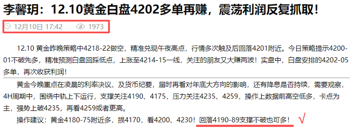 12.3 上周三,黄金日内波动较小,不及策略预期,不过馨玥也公开安排了4197-95多单,美盘也是大涨至4240大幅获利!今天又是全网公开现价单!