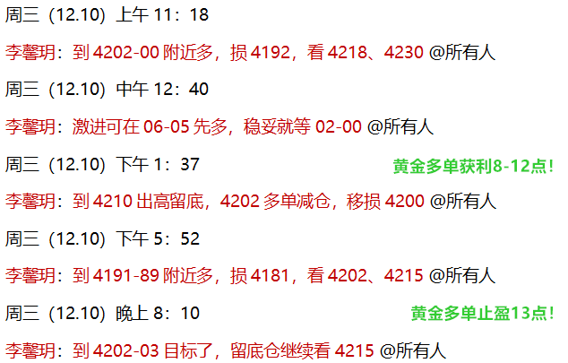 12.10 黄金昨晚策略4218-22做空,精准兑现高点,行情多次触及后大跌!今日白盘策略4200-01不破先多,欧盘策略4189做多,都精准预测回踩低点,关注的朋友又是三波大赚利润!实盘中,白盘同样安排了4202-05多单,在4210获利!晚间又按策略,安排了4189多单,顺利在4202-03止盈,留底仓继续博弈更大利润!思路正确,利润自然手到擒来!本周8连胜保持中!