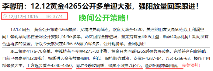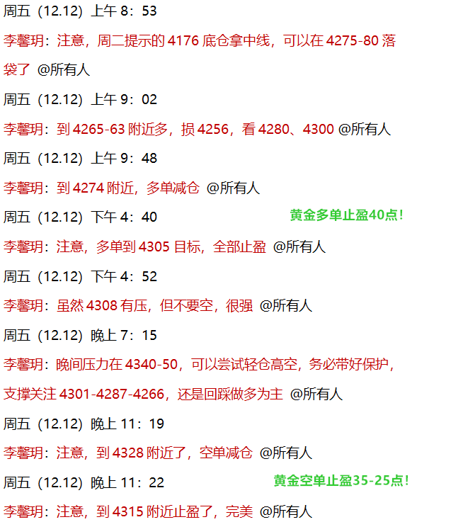 12.12 周五,黄金公开策略4265做多,又精准兑现低点,大涨至4340,关注的朋友又是 点以上利润空间!馨玥早间也在全网公开安排了4265多单,两次回踩全部进场,拿到4305止盈落袋!晚间又提前安排了4340-50空单,到4315附近再收利润!周尾多空双杀,两单斩获65-75点利润!公开现价单,全网见证,可尽情查阅!年底新一轮波段又启动,大家一定要把握住机会!