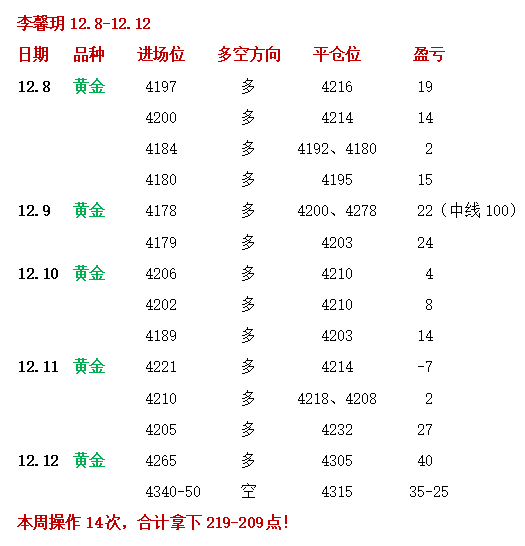 12.5 上周五,策略中提示黄金白盘先震荡对待,午后冲高4230后正是策略高空位置,馨玥也没有犹豫,公开安排了黄金4228空单,顺利回落至4215目标,收获12-13点利润!晚间文章中提示谨防冲高回落,行情同样完美应验!不过我们选择观望收尾,守好本周的利润即可!