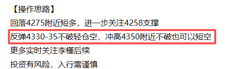早盘思路双双兑现!公开反弹4330、4350空都有不错的收获。其中4330空触及至少有给到10美金的利润空间,4350空更是精准预判日内最高点,我们实时也有通知大家4345空,截止目前最低触及4320附近,公开可查,李槿从不弄虚作假。
