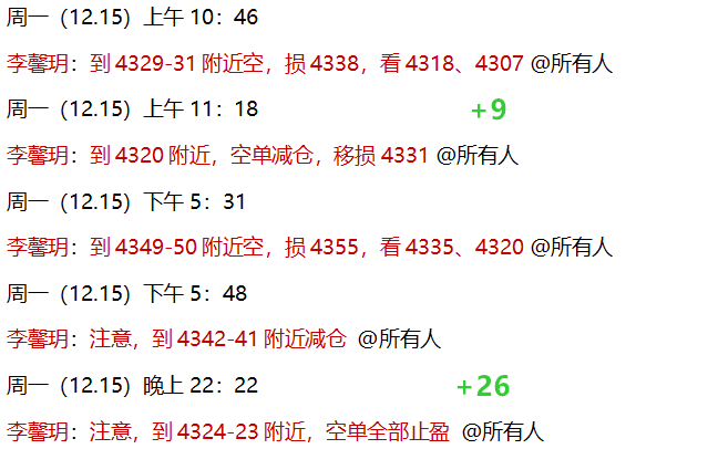 12.15 周一,黄金白盘策略提示压力4330、4350兑现大幅回落空间!今日实盘中,先是公开安排了4330空单,在4320减仓获利10点!晚间又安排的4350空单,下跌到4323目标止盈,再收26点!晚间按策略4320-18多的,首次触及后,反弹到4335附近,又是15点利润!日内多空点位,公开策略全部把握,实力全网见证,开门红又是轻松拿下!