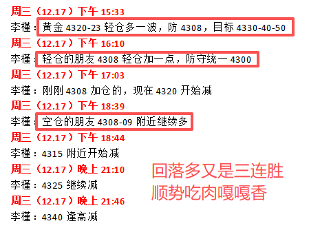 昨日回落多拿下三连胜!早盘公开回落4275多,实时也有公开提示,实战同步跟进,又是最低点的多。晚间一路拉升,晚间最高触及4335,低位回测筑底完美符合预期。