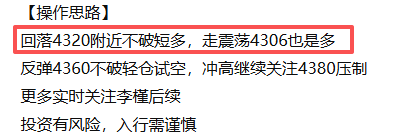晚间还有操作的朋友回落做多思路不改,有低位多单的朋友小仓大胆持有。上方阻力关注4350,这里不破不要盲目追多了。上方强阻力看4380,二次冲高不破的话,回落风险要警惕!