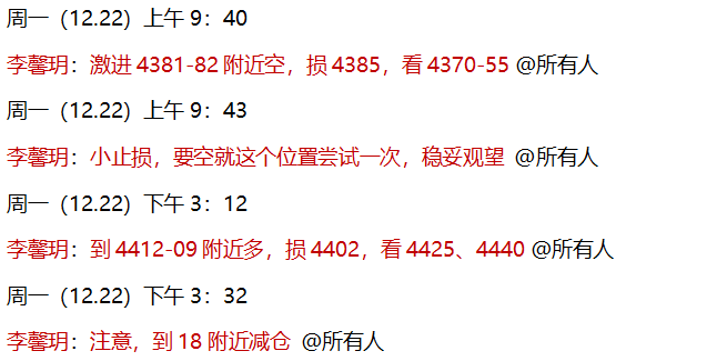 12.22 实盘中,早间先试探性安排了4381-82空单,回落力度不足,在4385小损离场!午后强势无回踩,安排的4410-12多单,在4418获利减仓,余仓继续持有中!