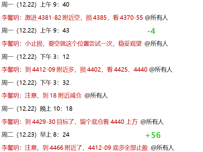 12.22 实盘中,周初早间先试探性安排了4381-82空单,回落力度不足,在4385小损离场!午后强势无回踩,安排了4410-12多单,欧盘文章中也公开,坚定持有到4429-30目标减仓,底仓隔夜在4466止盈!整体收获56点利润!横有多长,竖有多高,既然回踩无力,就需要灵活应变,公开多单顺势跟进,拒绝马后炮!