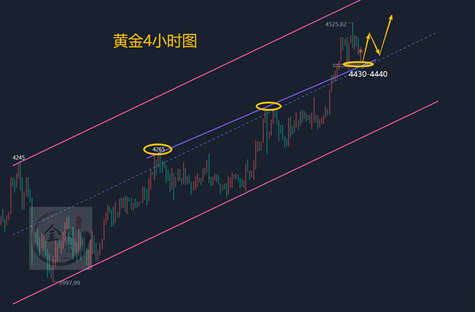 由于圣诞节前夕短期资金的获利出逃,导致小幅回落,但还是难以抵挡强势格局的行情,昨晚短期收盘于4480,大趋势短期还是有冲击4550/4600的动能,后市交易的思路,还是应当顺势看多,暂时没有阶段性回踩的迹象,后市应当围绕4400-4430区间逢低做多为主。对于明天周五短期关注4450之上继续看涨4500或更高。综合来看,金晟富黄金短线操作思路上金晟富建议回调做多为主,反弹做空为辅,上方短期重点关注4530-4550一线阻力,下方短期重点关注4440-4430一线支撑,各位朋友一定要跟上节奏。要控制好仓位及止损问题、严格设止损,切勿抗单操作。具体点位以盘中实时为主,欢迎前来体验,交流实时行情,进群关注实时单。