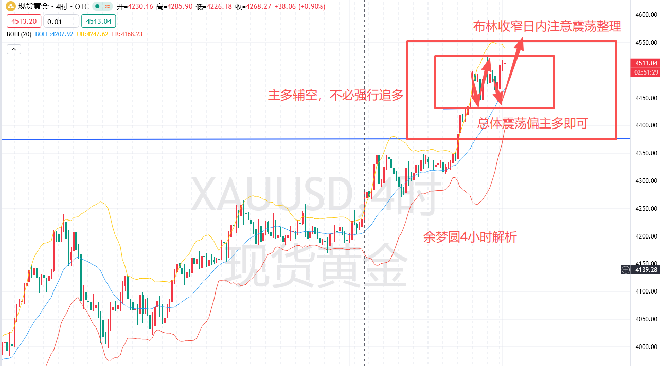 总体而言4小时布林逐步收窄上方短期压制4525-32区域,不建议高位进行追多容易被洗,等待回踩追多最优之选,依旧4450-40多下破30损。即便4500有追多的建议短利出局,位置决定信心!操作上就围绕4532-4450做高抛低吸,空短线获利,多保持中长线思路去对待,不必勉强追高!节奏上短空主多相互配合,掌握好节奏!