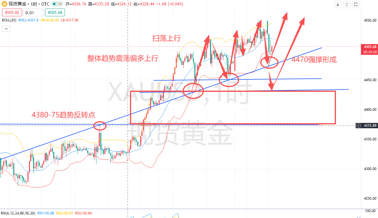 黄金技术上,务把洗盘当短期趋势的反转,顺势而为主多仍是主要基调,短空只是辅助配合进行!短期强撑4470再次形成,回踩多依旧是日内最优只选,切勿因为短线思路错过大格局上多头利润。操作建议上预期再回到4480-70有点难度,所以多单尽量提前一些(4490-80区域分批看涨下破4470损)目标4520破位看4550-5600!多空中长趋势反转位置关注4380前期双顶位。4小时来看价格仍位于布林当中整理算不上真正意义上转弱。