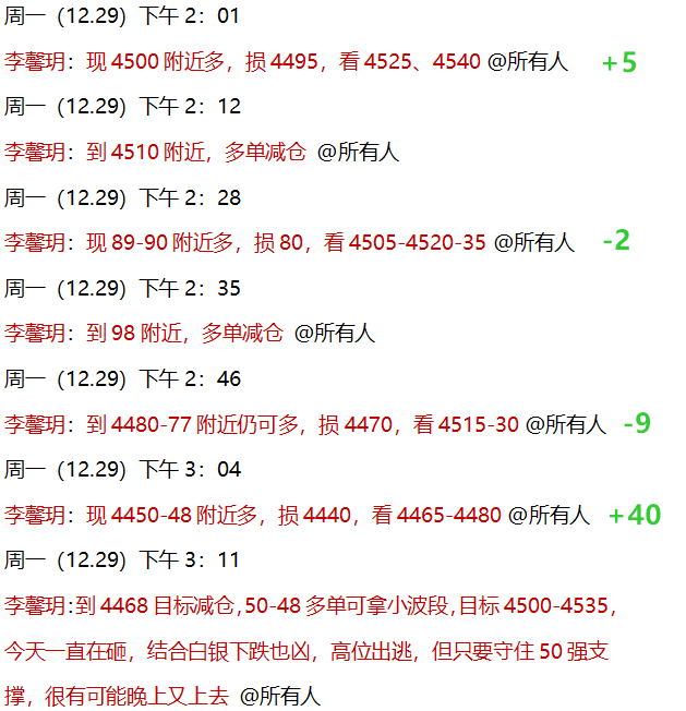 12.29 周一,黄金日内受白银洗盘影响,波动同样剧烈!馨玥这里午后先公开安排的4500多单,在4510获利减仓!而后实盘中安排的4489-90多单,也在4498获利减仓!继续按策略安排的4480多单,在4470扫损离场!到4448-50又继续安排接多,已上涨至4488大赚减仓!每日操作公开呈现,偶尔止损并不可怕,能够相负相抵之后,不断的形成正增长才是目标!