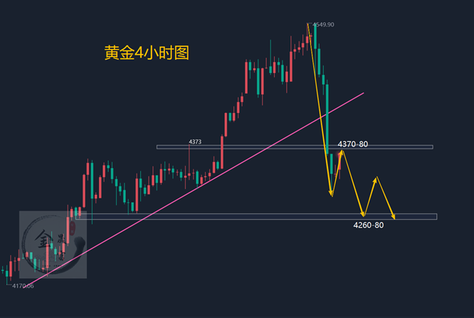 黄金技术面分析:昨日黄金至4550压制下行以来,价格在跌破4520正式转空,美盘一度下行到4303,下跌波幅达到了247美元,只要你有看晟富策略的,那么必定是可以进场空单的,而昨日也是直接从4520一线跌至4330,而中线布局,这之中最起码百点的利润是可以到手的,在这也恭喜一直关注晟富的朋友!从盘面来看,日图大阴报收,短期阶段性顶部已经显现,日线收阴。单看日线,今天还有低点,但是大跌之后也不排除行情修正收阳,所以今天暂时按照震荡思路。日线短周期均线也开始逐步勾头向下发散在日线走势上有开始走弱的意思了,短期关注下4370一带的压力带。