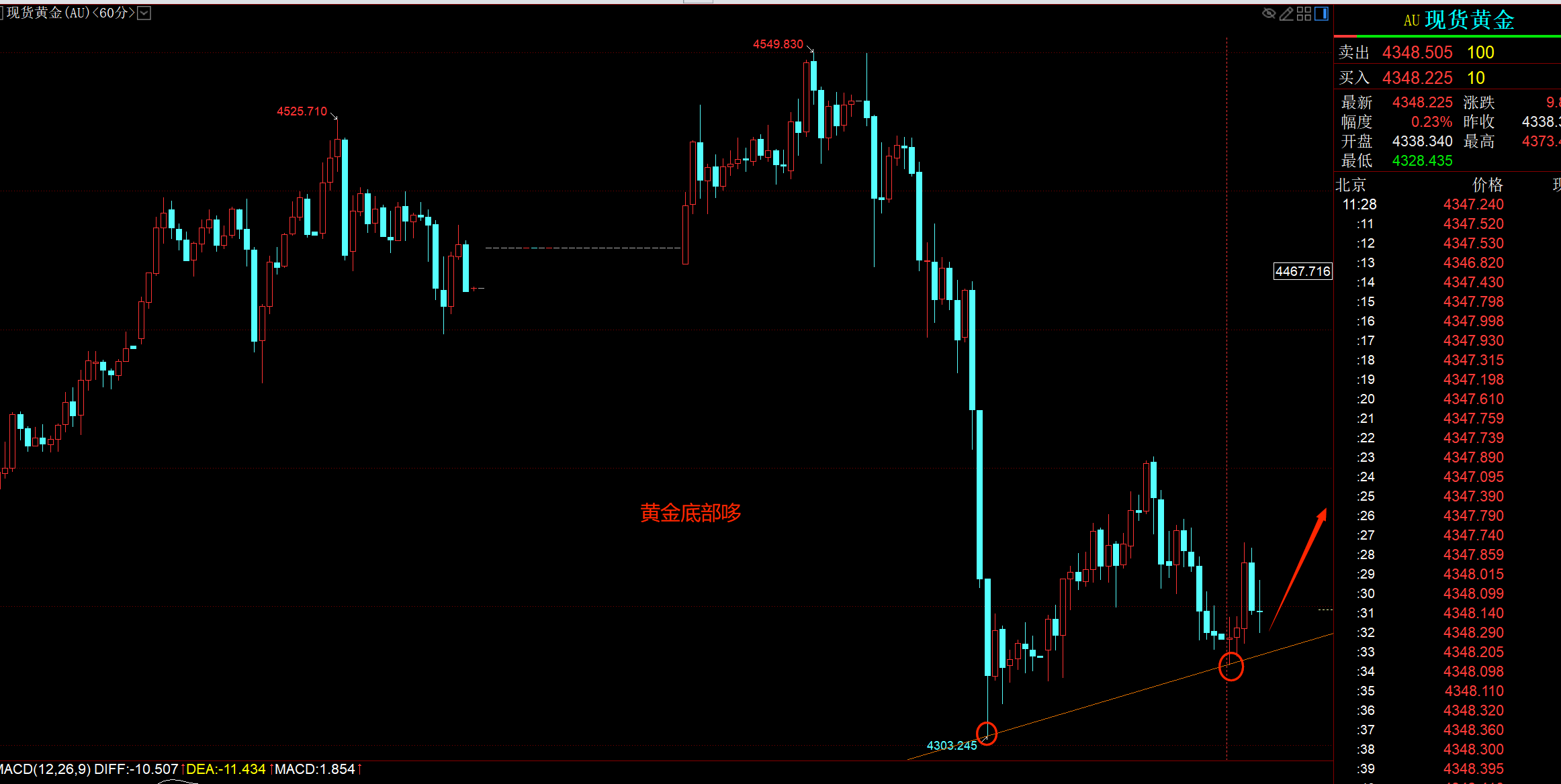 黄金经过周一的大跌,短期黄金处于底部震荡,低哆为主,今天早盘黄金实盘一路低哆操作,黄金如期上涨