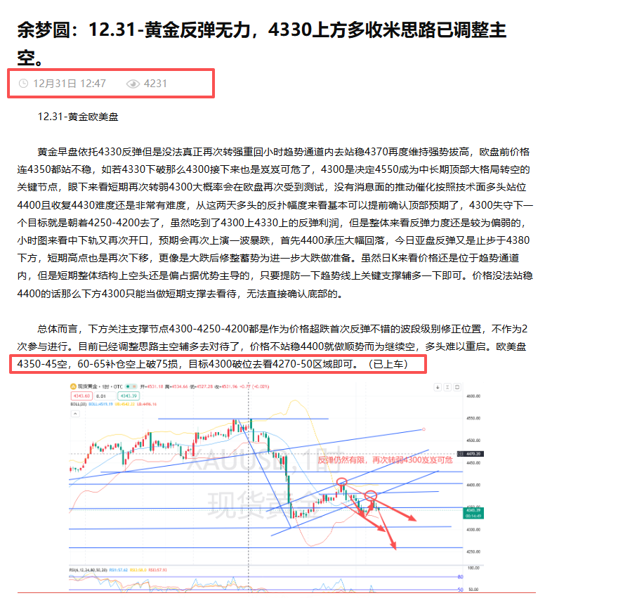 黄金,岁月更序,辞旧迎新,兜兜转转又是一年,依稀记得去年的一月份黄金价格大概在2600附近位置,而年底收盘于4320一线,上涨了1720个点,涨幅也达66%左右,可见在2025年黄金是一飞冲天,可谓飞扬跋扈为谁雄。而目前从历史新高4550一线开始回撤,跌幅也达220个点,涨跌的幅度也完全刷新了曾经的欲望,而本周一黄金触及到高点之后直接开始了跳水,后期开始了小幅度的震荡并且延续其弱势继续刷新低点,最低触及到4275附近位置,日线也是收于大阴线跟随小阴线的形态,目前对于多头而言并不乐观,趋势线已经有所动摇,而唯一下方的支撑布林线中轨位置也将会刺破,后期还需进一步的验证,而目前上方的压力则维持于4350附近位置,此位置也是前期的重要分水岭位置,而一旦此位置继续承压有效的话,则后期的空头将有可能会进一步的打开,而下方的第一目标则维持于4250附近位置,则伴随着空方的连续下跌,目前我们还是跟随其趋势继续做空即可,则周五黄金如先反抽于4345-50附近继续做空,目标看4300-4280附近,损4360,如欧盘强势,则需要重新调整位置
