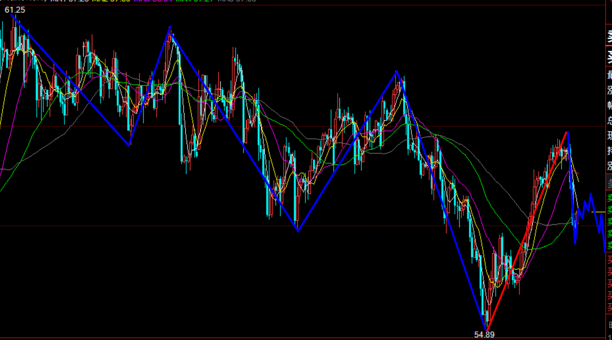 2,激进做空可以在58.15美元做空,止损就要放大15个点也就是45个点的止损了,止盈同上。