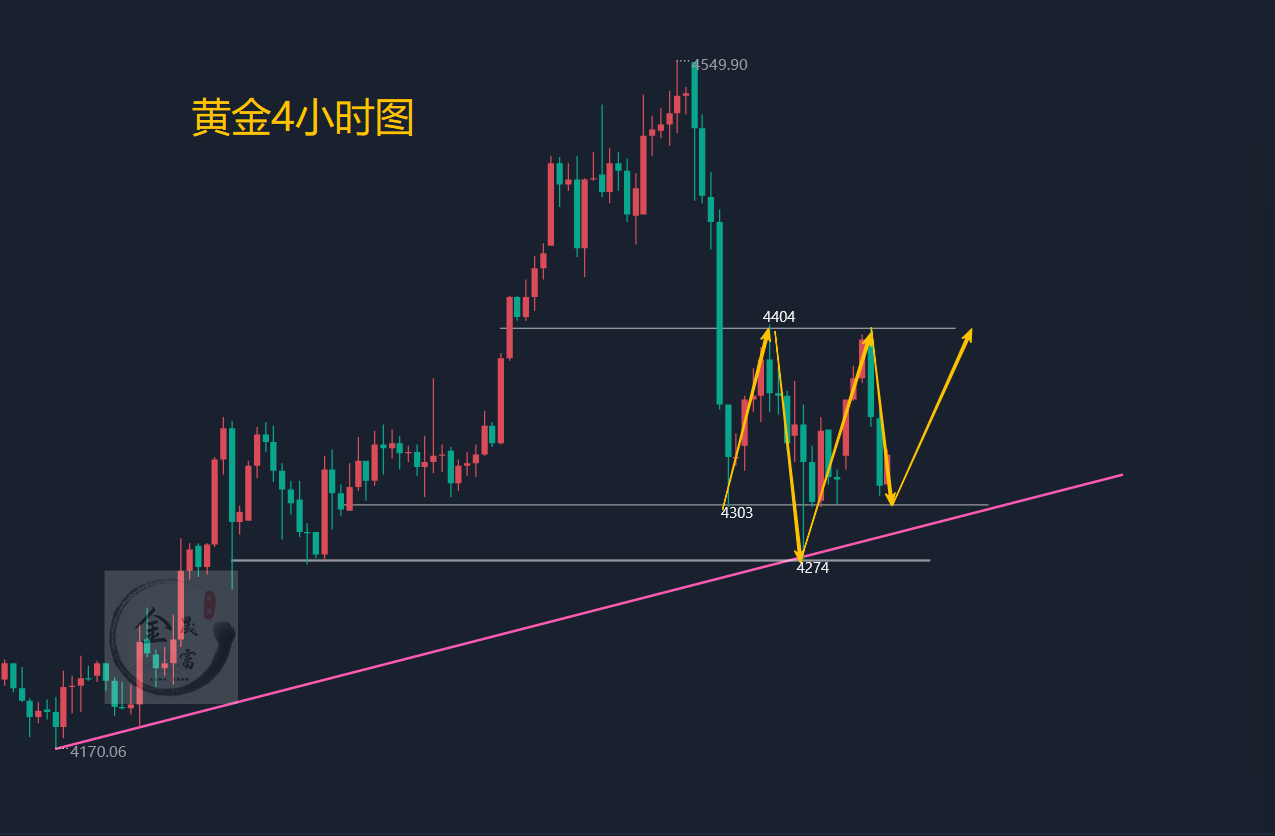 从4小时图观察,金价周五再度震荡走低,虽跌幅有限,但若有效跌破4300关键支撑,恐将打开进一步下行空间。目前短期均线组已拐头向下形成压制,MACD指标亦运行于0轴下方,空头动能有所增强。若价格先行走弱,则需重点观察4305-4300区域的支撑力度,首次触及或存在技术性反弹,本周两次试探4300,两次反弹4400,属于大跌后结构性的调整。周五我就强调过,这波黄金在底部已经有头肩底形态,站稳4400后,多头会再次爆发,上看4500,4550并且大趋势下不猜顶,但没有站稳4400,则属于大跌后的低位震荡,所以,下周大概率也是如此看法,目前收盘在4330附近,下周开盘是否又跟本周开盘走相反的走势呢,加上周末避险消息刺激,晟富认为大概率会直接上涨。综合来看,下周一黄金短线操作思路上金晟富建议回调做多为主,反弹做空为辅,上方短期重点关注4400-4405一线阻力,下方短期重点关注4270-4300一线支撑,各位朋友一定要跟上节奏。要控制好仓位及止损问题、严格设止损,切勿抗单操作。具体点位以盘中实时为主,欢迎前来体验,交流实时行情,进群关注实时单。